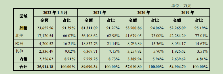 据招股书显示,2019年-2021年以及2022年1-3月,众鑫股份的外销收入分别为52265.09万元、53700.86万元、81311.09万元以及23657.56万元,占比分别为95.19%、94.06%、91.27%、91.29%,其中出口北美的销售收入占同期主营业务收入的比重均超过60%。相比之下,内销市场占比较低。