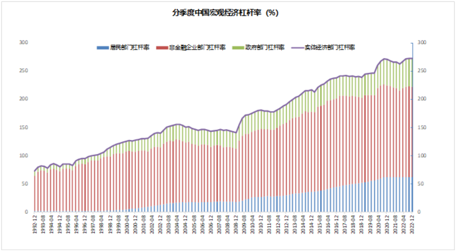 生产型社会的上限是杠杆。 根据国家资产负债表研究中心的数据,2022年中国实体经济宏观杠杆率是273.2%。从国际比较的角度,总体水平已经处于国际前列,尤其是居民部门杠杆率和非金融企业部门杠杆率,基本上加无可加。