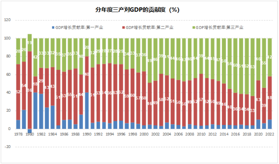 换一个角度,中国第三产业也就是服务业的占比相对也比较低。最近三年,服务业对GDP的贡献率整体有比较大的收缩,2022年回落到只有42%。像美国这一类的发达国家,第三产业增加值甚至能够占到GDP贡献度的80%。