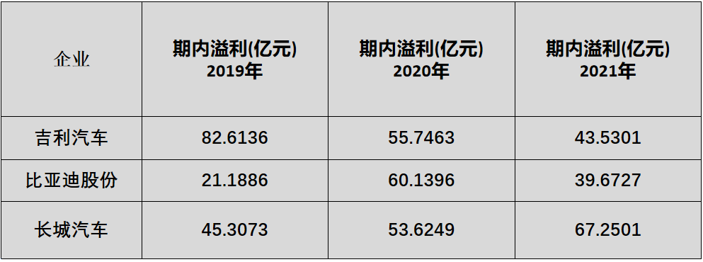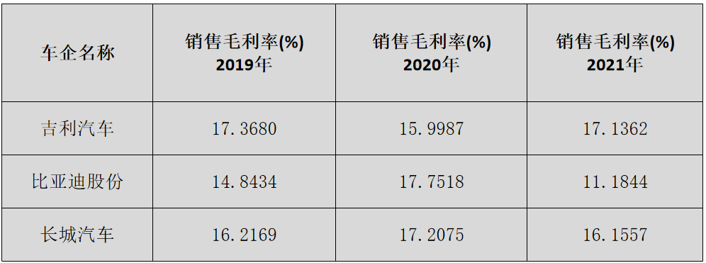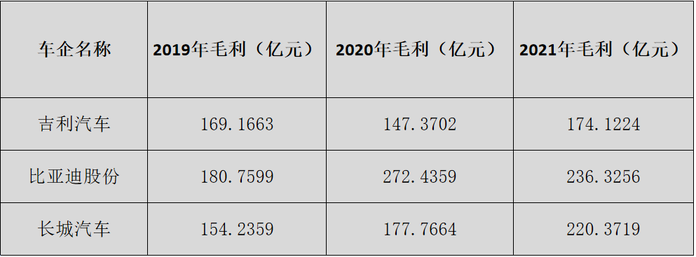 比亚迪的毛利从2019年的180亿,一直飙升到2021年的236亿,长城汽车由2019年的154亿,飙升到2021年的220亿元。吉利汽车是最低的。