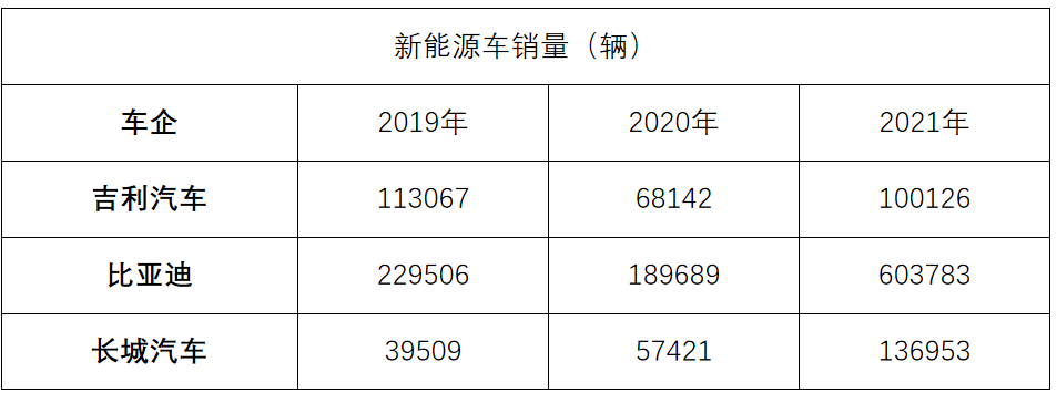 再看看比亚迪,2019年新能源卖了22万辆,2020年,因为补贴下来了,卖了18万辆,2021年一下飙到60万辆。长城汽车2019年新能源卖了3.9万辆,2020年新能源卖了5.7万辆,2021年新能源卖了13万辆。