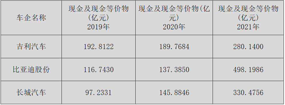 最后看一下现金情况,吉利汽车2019年现金及等价物是192亿元,到了2021年是280亿元,也没增加多少,90亿左右。