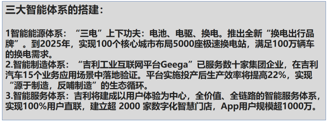 三是智能服务体系,吉利汽车建立超 2000 家数字化智慧门店,App用户规模超1000万。