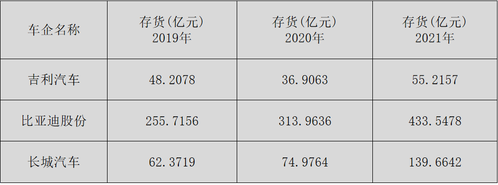 吉利汽车的存货从2019年的48亿上升到2021年的55亿,存货基本没有增长。但是。比亚迪存货从2019年的255亿,飙升到了2021的433亿。长城汽车也翻倍了,由2019年的62亿翻倍到2021年的139亿。
