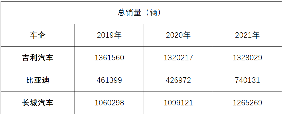 2019年,吉利汽车总销量136万辆,比亚迪总销量46万辆,长城汽车总销量是106万辆。