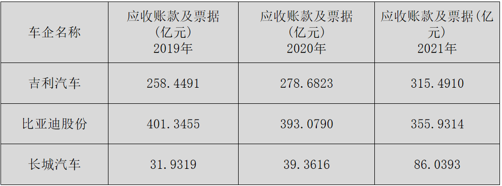 应收账款及票据方面,吉利汽车2019年是258亿,2020年是278亿,2021年是315亿,应收账款是越来越多。