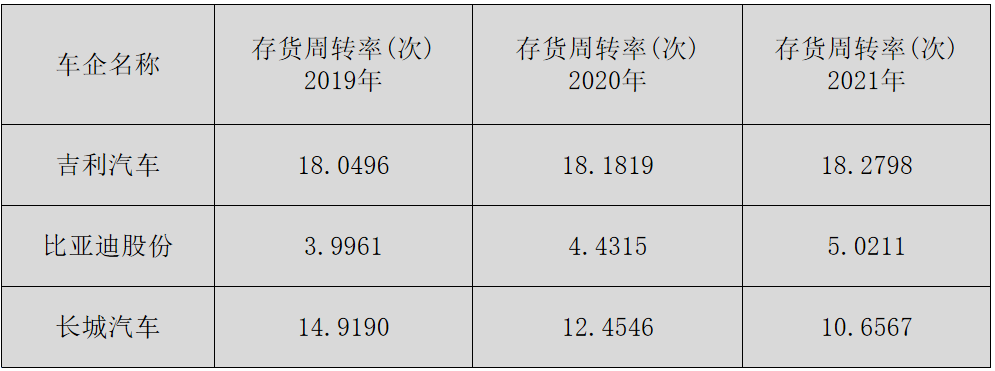 从存货的周转率,我们就会发现吉利汽车的存货周转率大概是20天左右,比亚迪的存货的周转率是90天左右,长城汽车的周转率大概是30天左右。