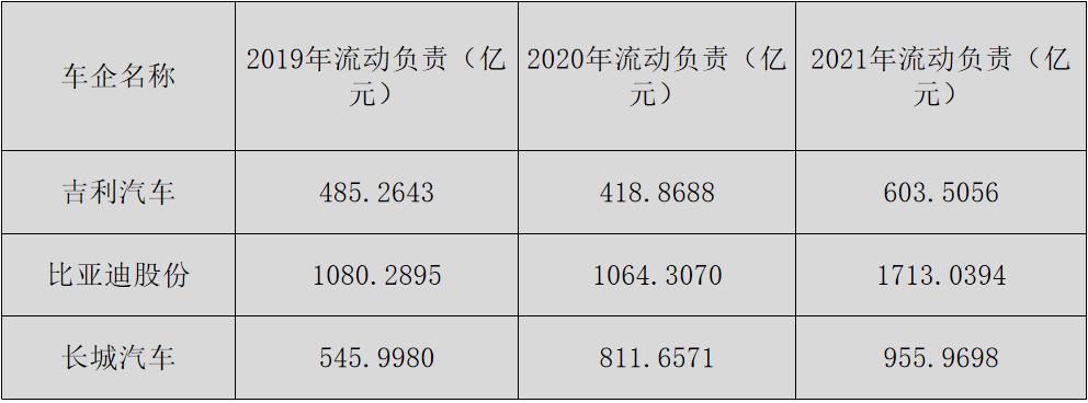 比亚迪由2019年的1080亿的流动负债,上升到2021年的1713亿的负债。