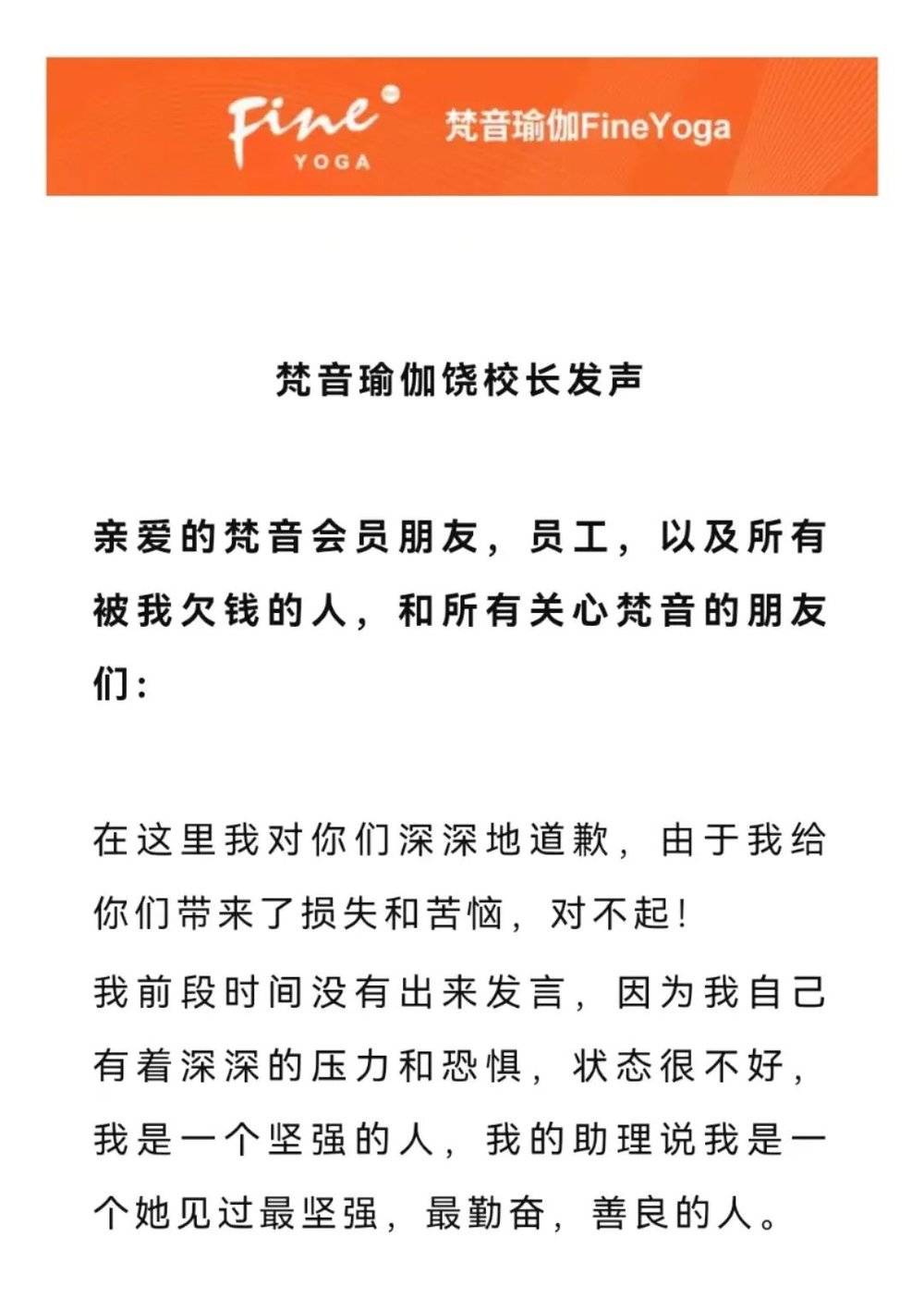 2月25日,梵音瑜伽社群内部“停业整顿”的消息传出,即日起,全国82家门店一夜闭店。次日,梵音瑜伽的创始人饶秋昱(饶秋玉)在公众号发文,回应欠债风波,历数自己在疫情时期经营不易,但对于梵音2000多名员工的生计、上万会员后续的课程安排没有任何交代。