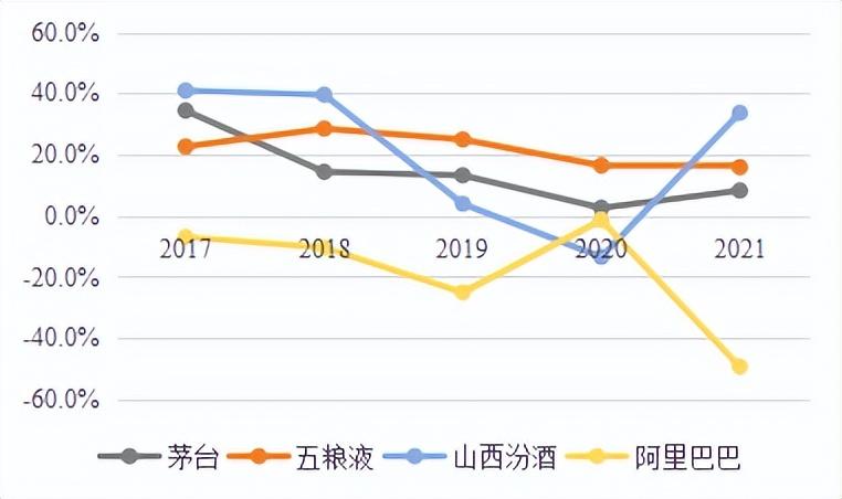 白酒企业的人效增长率基本为正数,且大量时间保持在10%-30%的高位(注:山西汾酒2020年实现17.6%的营收增长,同年为扩大市场规模,公司大量扩招营销团队,这也是2020年人效下降的原因)。而阿里巴巴近六年人效增长率均为负数,且下降趋势有放大风险,其复合增长率为-20.76%。