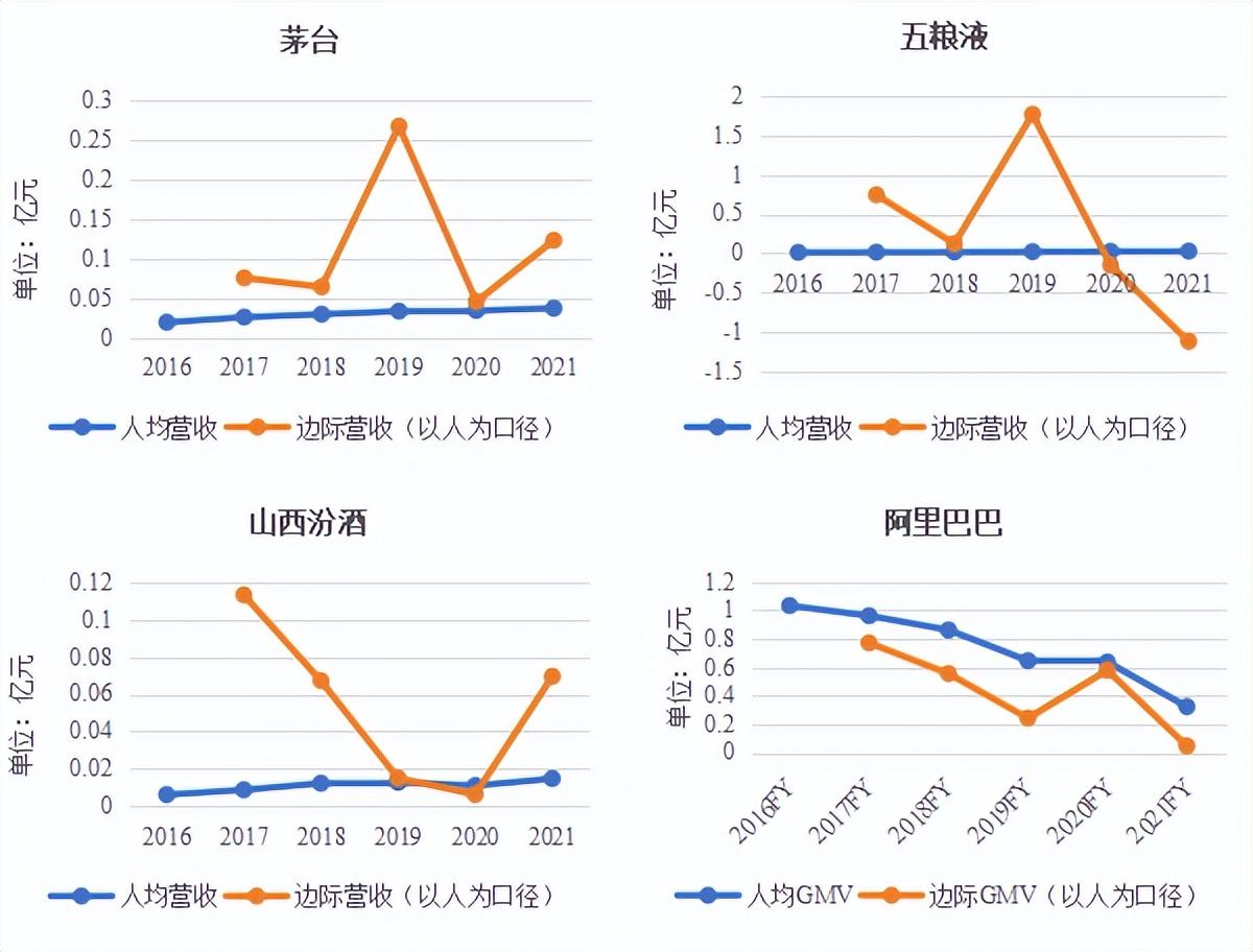 这里可能有人会问,即使阿里人效呈现出下降趋势,但绝对数仍然高于白酒行业,这是由于白酒和互联网的行业属性不同。对于阿里这类平台企业来说,如果用营收数据计算人效,结果可能就不那么好看了。