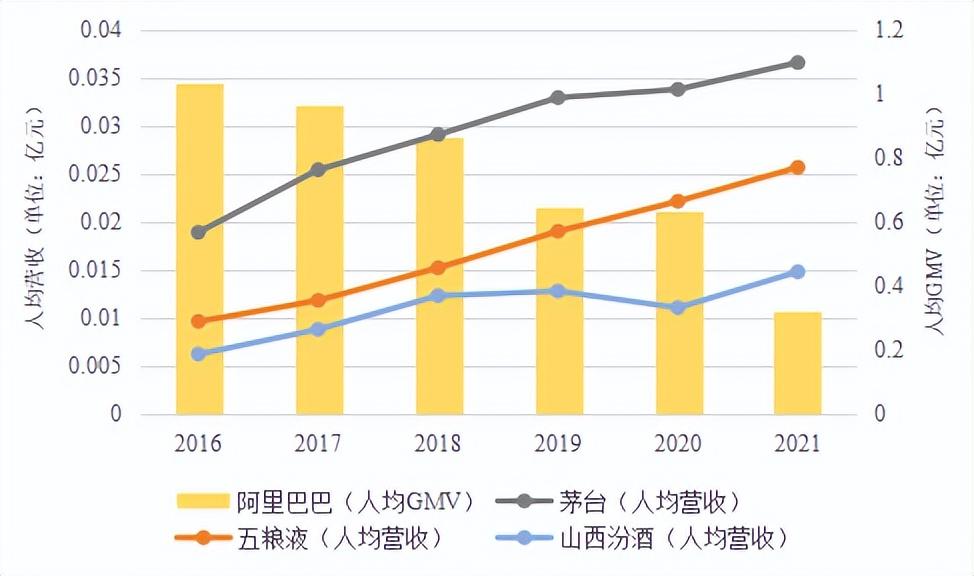我们选取了白酒行业市值前三的企业(贵州茅台、五粮液、山西汾酒)和自2015年来,冠名春晚次数最多的互联网企业阿里巴巴,对这4家企业的人效进行分析。