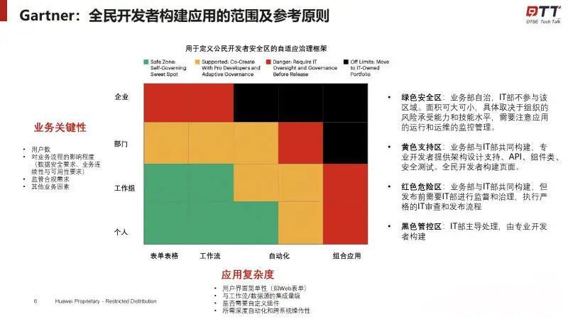 Gartner曾经制定过一张全民开发者构建应用的范围及参考原则,将整个开发框架按颜色分为4个核心部分,其中绿色的安全区及黄色支持区,是低代码的射程范围。