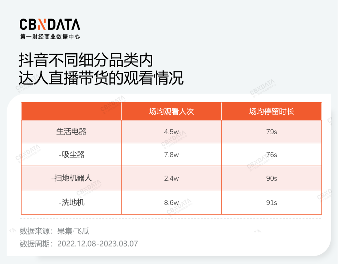 更直接的直播带货环节,破圈趋势同样有所体现。达人直播不仅意味着销量本身,还代表着品牌辐射到的人群范围。智能清洁家电品牌通过大量绑定科技、家居、生活、穿搭、母婴等多领域的腰尾部达人,触达更多用户,提升品牌声量。果集·飞瓜数据显示,以场均观看人次或场均停留时长为衡量标准,扫地机器人、洗地机的达人直播更能吸引观众,远胜于生活电器大类以及吸尘器这一相对成熟的品类。自播阵地内,多数品牌批量开设出自播间进行长时直播。在划分自播间时,无论是类似追觅以品类为主要依据,还是类似添可以经销商为主要依据,都可以帮助品牌针对性触达不同地域、圈层、消费水平的用户。