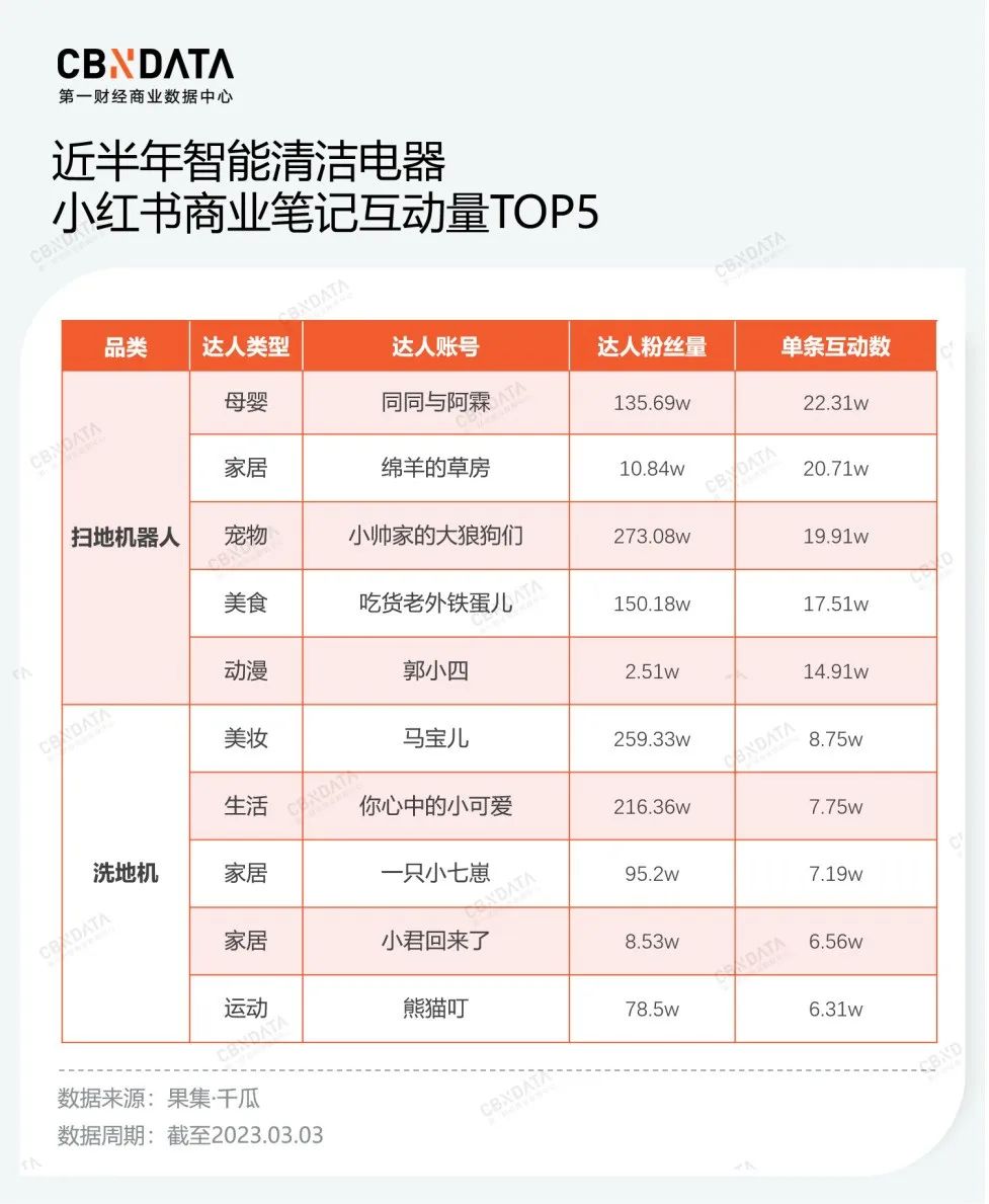 根据CBNData观察,不少品牌在内容种草环节,会密切合作美妆时尚、家庭生活、萌宠类达人,精准锚定时尚丽人、母婴用户、独居女性等用户群体。果集·千瓜数据显示,扫地机器人、洗地机在进行小红书投放时,互动量TOP5商业笔记横跨多个博主类型,笔记内容围绕沉浸式护肤、高质量居家、送礼、治愈等主题展开。在CBNData联合Yigrowth发起的“归流·2023消费品牌流量营销年度观察”主题直播中,追觅科技中国区副总经理郭人杰表达了类似的观点:由于洗地机的渗透率较低,如果局限于已有用户进行种草,会造成越来越卷的状态,所有品牌都应该重视破圈这件事,比如联动美食、旅游、健康博主进行种草,寻找圈层以外的消费者。