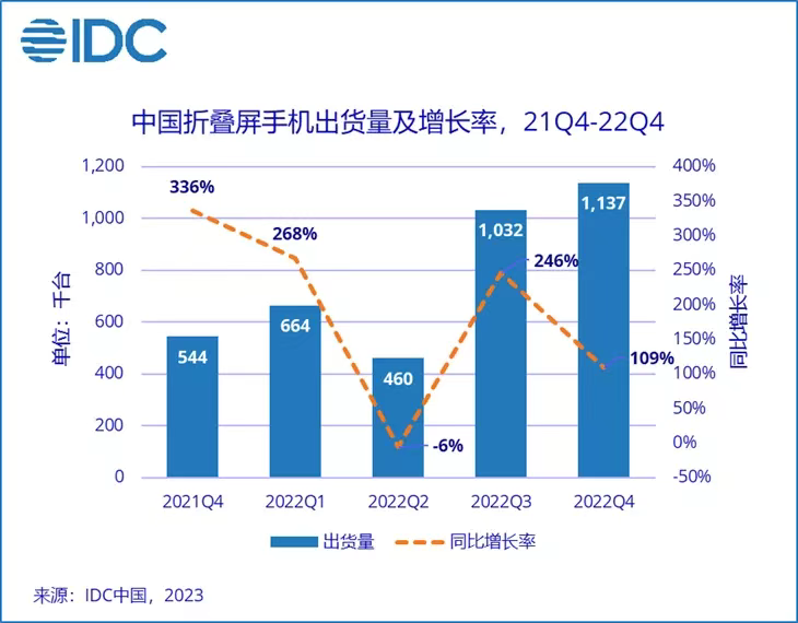 2022年,中国市场折叠屏手机的全年出货量近330万台,同比增长了118%。其中,仅仅在第四季度,出货量就有110万台。