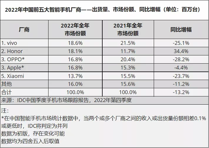 IDC日前公布的数据显示,2022年全年,中国智能手机出货量约为2.86亿台,同比下降了13.2%,创下有史以来最大的降幅。