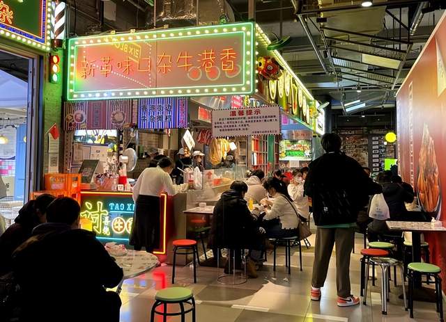 中午12时左右,合生汇地下的21街区内已经烟火气十足。地方小吃、甜品奶茶颇受欢迎,许多摊位前挤满了等候取餐的客人。