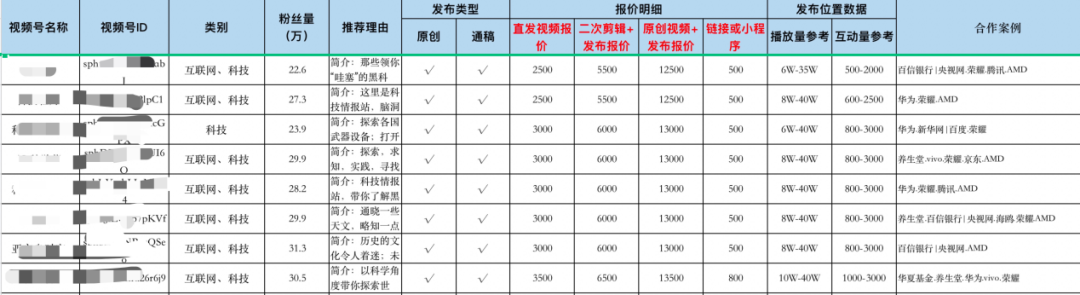 不过,视频号大V主要收入来源以行业头部公司为主,可是大多小打小闹。下图可以看出,一个粉丝量在30万左右的互联网科技类视频号,一条原创视频内容的报价在13000元左右,其合作客户不乏华为、京东、AMD等科技巨头。