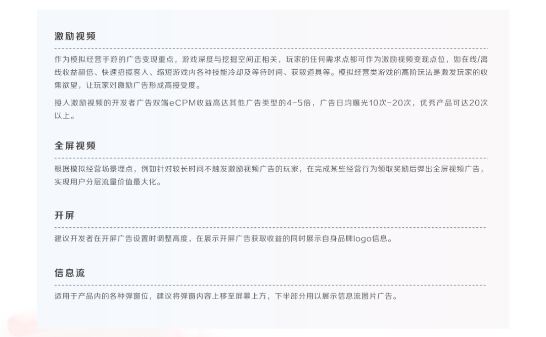 模拟经营手游市场上较为通用的广告场景及变现情况如下,开发者可结合游戏玩家使用行为进行广告场景的设置及进一步优化,最大化提升收益空间。