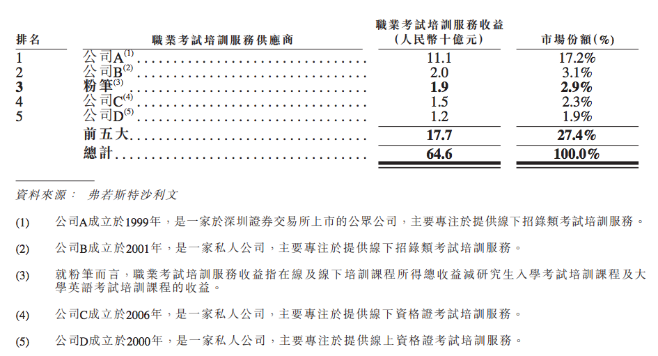 不过,按照两家披露的2021Q3数据而言,粉笔和中公的收入分别为23亿元和63亿元,在9个月时间里,粉笔已经将差距缩减至2.7倍,这也表示粉笔的市占份额已经夺得第二把交椅,并且正快速追赶中公。