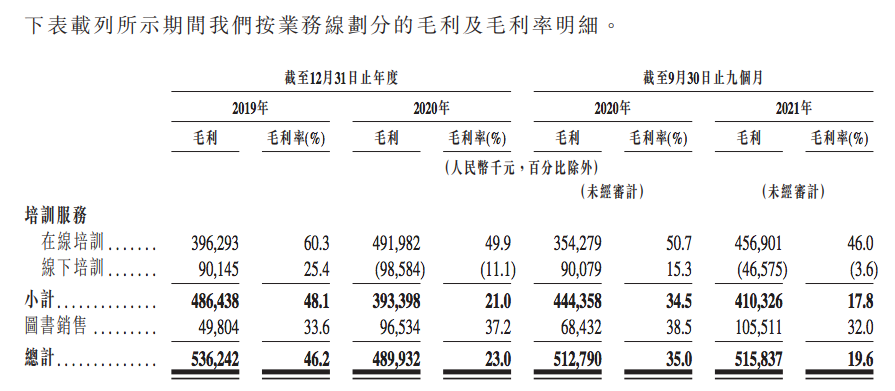 两年来的线下大规模扩张主要花在雇佣教师、场地租金、以及相关运营开支上,从而使公司毛利率从2019年的46.2%下降至2021Q3的19.6%,2020年和2021Q3合计亏损超过11亿元。