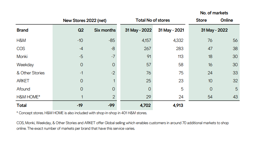 从财报数据来看,2022年前半年,H&M集团旗下所有品牌全球关闭了99家门店,第二季度关闭了19家,全球仍有4702家门店,与去年同期相比减少了211家。