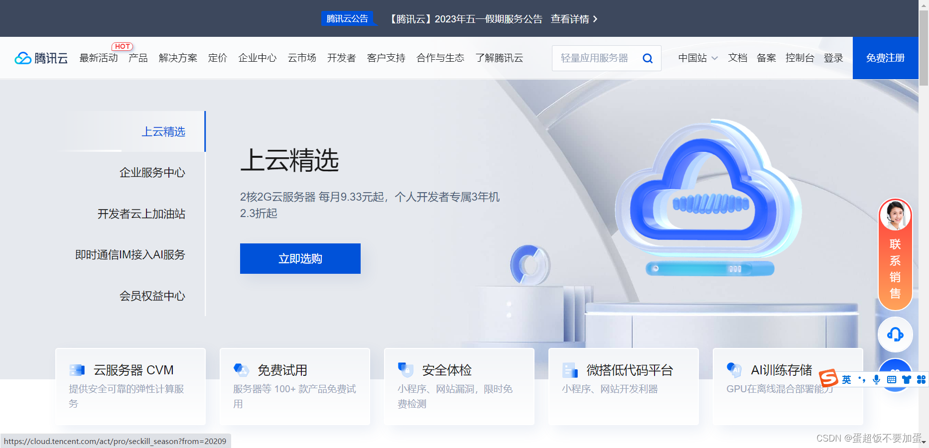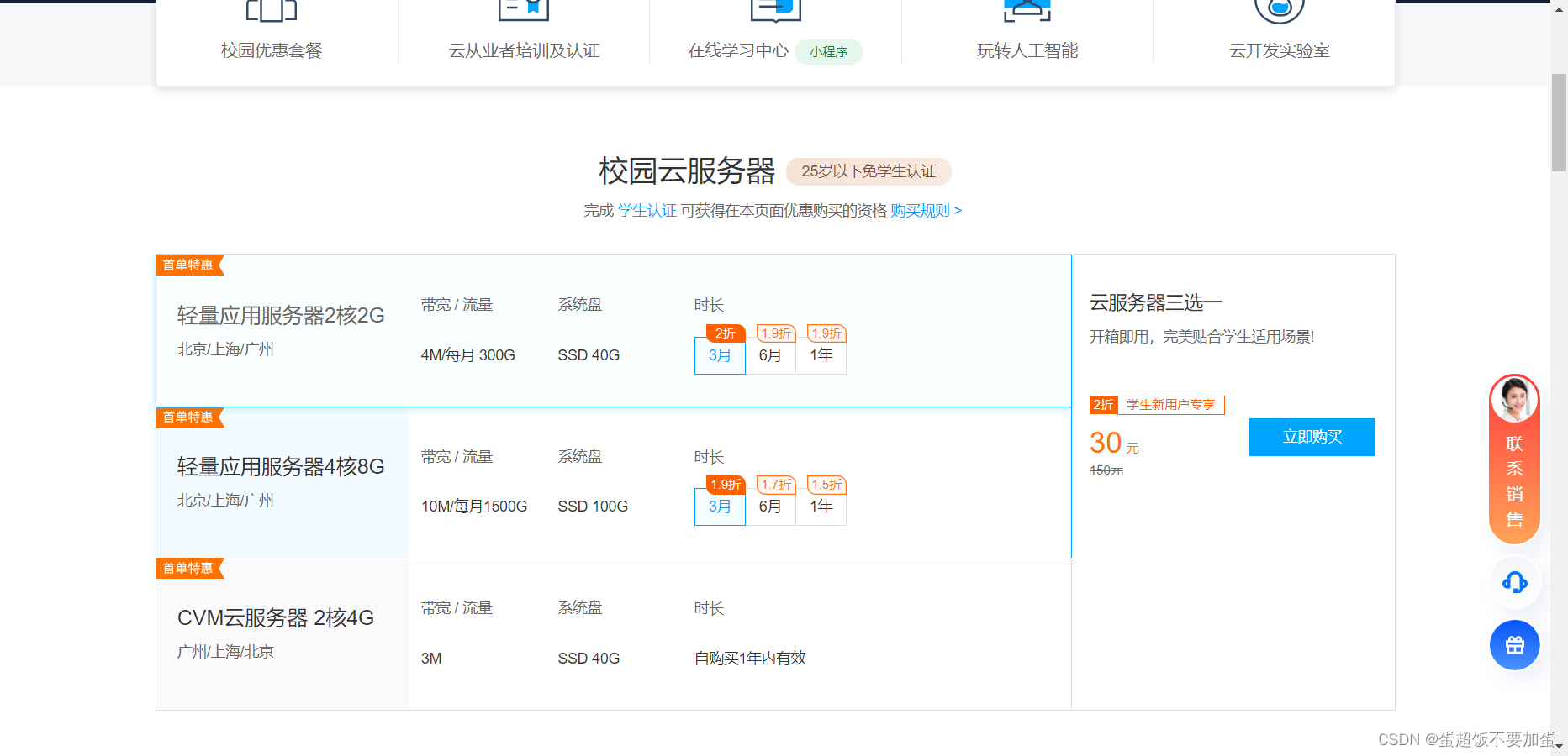 4.选择最便宜的一个云服务,最便宜的2核2G的云服务器对于我们学生来说已经够用了
