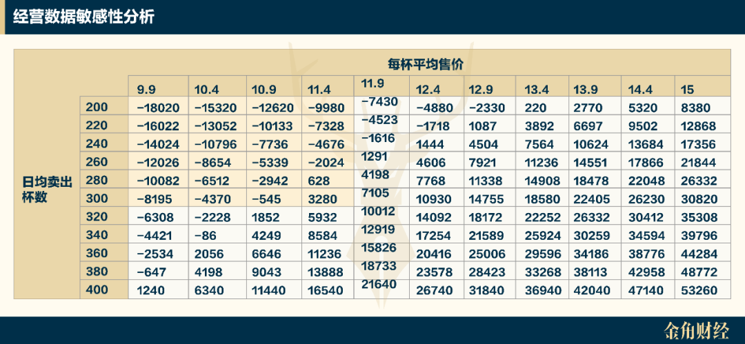 就会发现若日均杯数在300杯以下、均价在11.4元以下,基本处于亏损状态,要知道日均300杯非常不容易做到,且均价11.4元也意味着比现在提价超过15%;