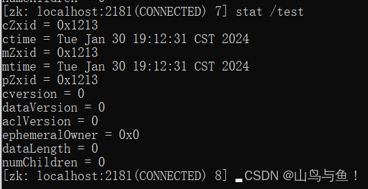 ephemeralOwner:如果该节点为临时节点, ephemeralOwner值表示与该节点绑定的session id。如果不是, ephemeralOwner值为0(持久节点)。