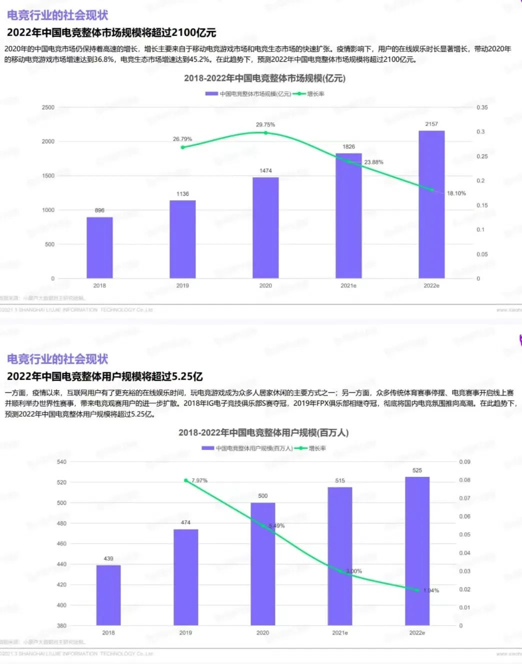 根据《2021中国垂类电竞KOL发展洞察行业报告》,2022年中国电竞整体市场规模将超过2100亿元,整体用户规模将超过5.25亿,市场热度更是高居不下,从2020年6月至2021年4月,电竞、热门电竞游戏、热门电竞赛事的全网月平均热度达到0.44亿,而在王者荣耀世界冠军杯期间,热度更是达到0.66亿。一个又一个亮眼的数据仿佛预示着,中国电竞市场一片欣欣向荣,进入了黄金发展的“快车道”。