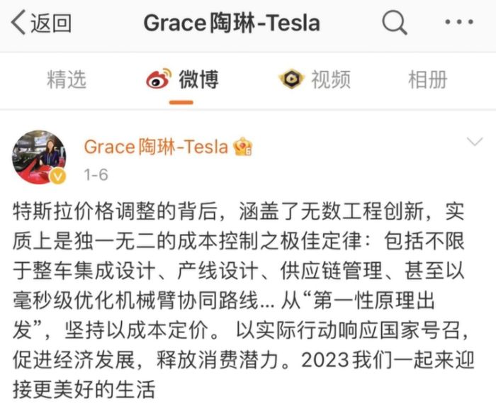 对此,特斯拉对外事务副总裁陶琳曾通过个人微博表示:“特斯拉价格调整的背后,涵盖了无数工程创新,实质上是独一无二的成本控制之极佳定律”,她声称“特斯拉从‘第一性原理出发’,坚持以成本定价。