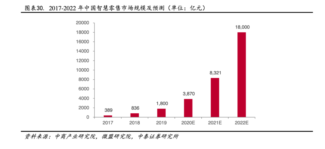 根据《2021中国品牌数字化实战研究报告》,近70%的中国零售企业已开始构建数字商业化业务。根据中商产业研究院与微盟研究院的数据,2022年智慧零售市场规模将达到1.8万亿元,市场前景广阔。