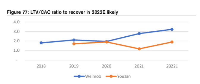 根据瑞信计算,有赞2021年LTV/CAC比率(客户在其生命周期内的价值与获客成本)为1.0左右,SaaS行业一般将LTV/CAC>3作为衡量企业经营是否健康的关键指标。