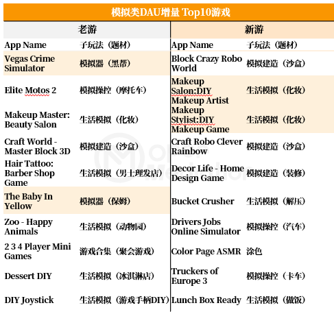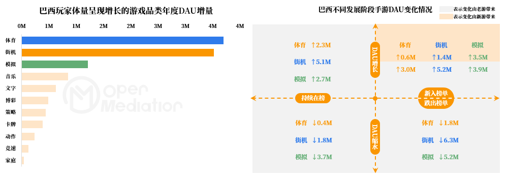 就手游来说,巴西头部品类实现DAU增长,体育(↑37%)、街机(↑17%)、模拟(↑7%)增量最大,文字、卡牌、博彩、家庭等DAU尾部品类也呈现出较大幅度增长。所有DAU增长的品类中,体育、街机、模拟增量在100万以上,其中体育(代表游戏《 Panini Sticker Album》)和街机(代表游戏《Subway Surfers》)的增长依托于老游持续发力。模拟类游戏新游老游协同发展(代表老游《Vegas Crime Simulator》,代表新游《Block Crazy Robo World》)。