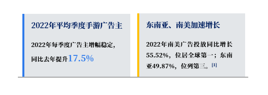 - 买量:厂商逐季加大买量投放的力度,2022年广告投放季度同比增长17.5%;而这些增长更多来源于东南亚、港澳台和南美。