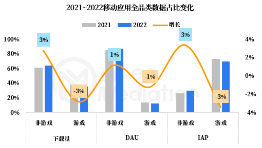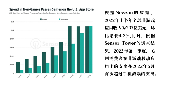 其二,竞争。2022年新游的淘汰率约为1/3,新游上榜7476款,新上架的非游戏应用仅为新游的1/2,说明游戏市场的新品空间更大,但更迭淘汰速度也更快。