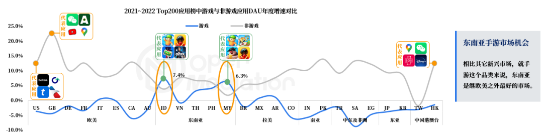 在全球大多地区2022年都出现了“非游戏移动应用”的流量增长超过游戏的情况;而在东南亚,“被非游戏反超”的问题相对缓和。