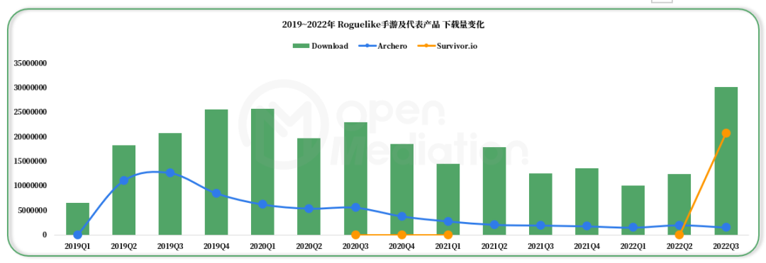 对比分析Roguelike在2019~2022年的表现,可以发现两个高峰值,分别出现于2019年底和2022年中,分别来自于《Archero》和《Survivor.io》的贡献。随着游戏的发展,《Archero》开始走下坡路,而以“生存+割草”为玩法的Roguelike游戏《Survivor.io》实现反超。