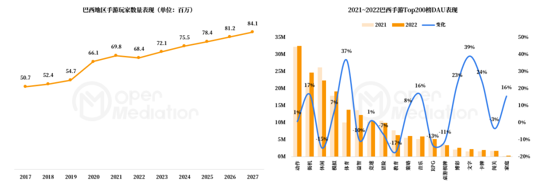 巴西是新兴市场中,手游发展态势相对较好的国家。根据Statista数据,截至2022年,巴西手游玩家数量为6840万,渗透率为31.7%。预测未来五年,巴西手游玩家持续增长,到2027年,将突破8400万,较2022年增长23%。