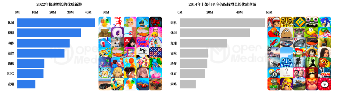 变现:2022年Q3,超休闲游戏的用户支出大幅增长,超过2021年同期水平,内购对于超休闲日益重要。2014年上架的老游持续成功运营到2022年的多为休闲向游戏,如《Subway Surfers》《Candy Crush Saga》《Township》等。2022年优质超休闲新游有《Tall Man Run》《Bucket Crusher》《Snow Race!!》等。这两组数据说明轻度优质新游市场验证速度快,长线运营空间大,休闲开发者要进一步探索内购与广告如何融合的商业模型。