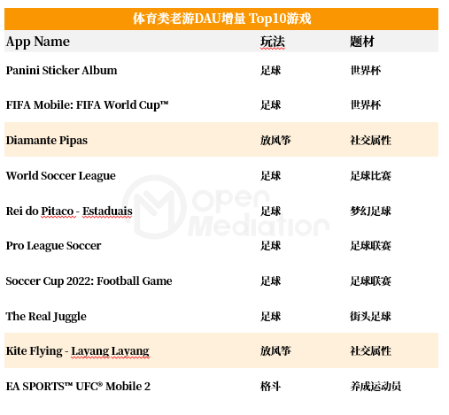 - 受“全民足球”和2022世界杯的影响,足球体育游戏持续增长;“放风筝”的社交体育游戏成为新现象。