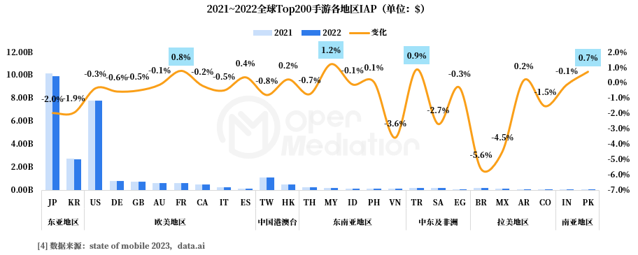 **虽然手游的用户支出在2022年Q2~Q3经历了半年的回暖,但整体来看,游戏用户的消费力仍未回到2021年的水平,2022年整体缩水5%,跌至1100亿美元。法国、马来西亚、菲律宾、土耳其、阿根廷、巴基斯坦实现用户支出逆势上升。