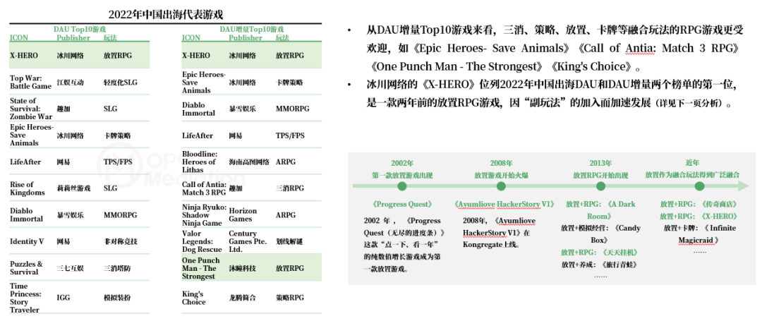 还有RPG及“放置RPG”的创新。RPG在玩法层面继续朝着“融合”方向发展,2022年“放置RPG”夺得RPG品类的出海用户增长冠军,得益于“副玩法”。