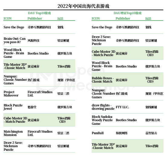 消除一直是传统玩法翻红的典型,2022年“Tile消除”出海表现亮眼。(相关阅读:“羊了个羊”在印度、巴西长什么样?)