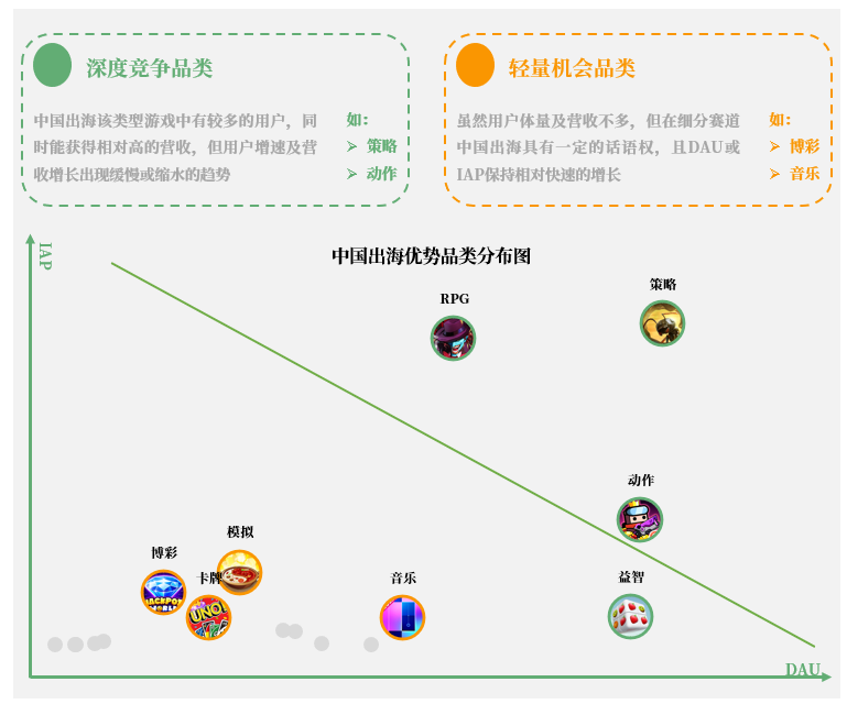 - 中国出海在策略、动作、益智三个品类中有明显的优势,但是这三个品类的市场份额正在衰减,策略游戏尤为严重,对这类产品来说,优质、创新、精细化运营变得更关键。
