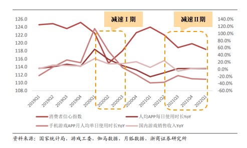 从阶段性规律来看,2020疫情元年促进了线上产业的阶段性繁荣,为期约一个季度;但随后消费者信心、App使用时长开始快速下降,产生了第一个减速期,持续半年;2021年下半年开始,游戏行业再次发展疲软,随着奥密克戎的全球扩散,这种减速一直延续到2022年第一季度。