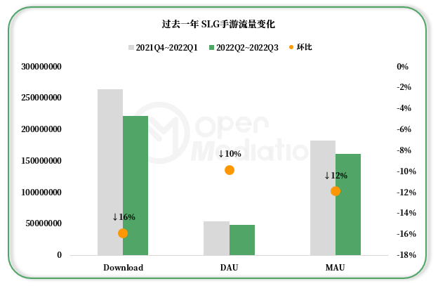 策略类游戏中,4X策略(SLG)是重要的组成部分,在策略类所有游戏下载量中,有超30%的下载量来自SLG玩法。SLG游戏在疫情初期得到快速增长,2020Q1下载量增长达到了26.2%,这个增长效应持续到了2021Q1,后面开始缩水。