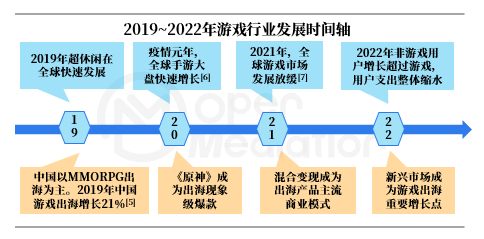 可以说,中国出海先后经历了从2019年以引领MMORPG出海为主,到2020年《原神》成为全球现象级爆款手游,再到2021年混合变现成为出海产品主流商业模式,终于在全球游戏市场整体低迷的背景下,不得不离开“舒适区”,再一次去开拓新市场。