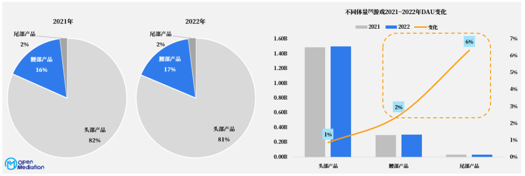 - 变现:游戏头部20%的产品占据了80%的市场份额,看似形成了头部垄断的情况。但是仔细研究后发现,腰尾部的游戏会有更大的发展空间和可能性。2022年,腰部游戏市场份额增长1%,增量超过700万。尾部游戏DAU增长6%,超过头部产品和腰部产品的整体增速。所以,腰尾部市场或许将释放更多机会,找准一群核心用户变得至关重要。